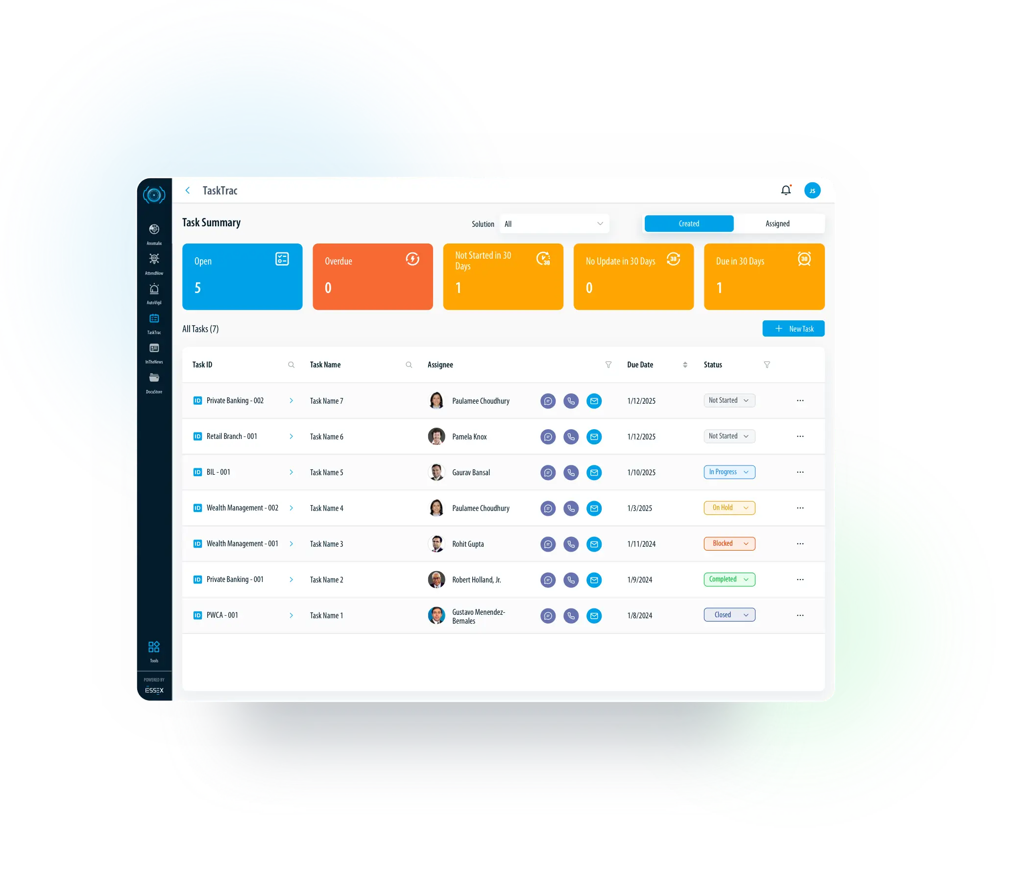 Allows Executives to assign accountability, track progress, and ensure compliance through continuous monitoring powered by the Governance Rule Generation Agent. TaskTrac keyboard_arrow_down