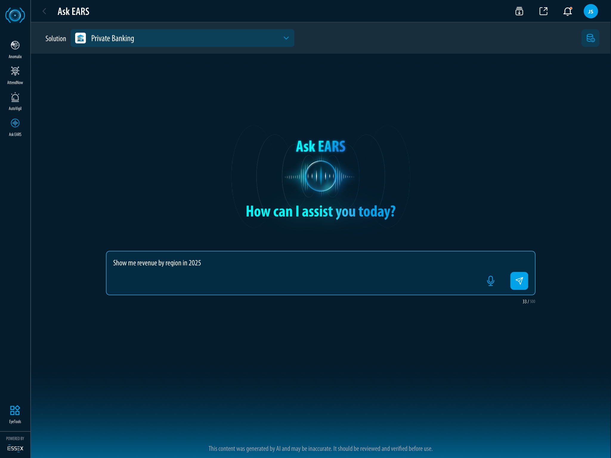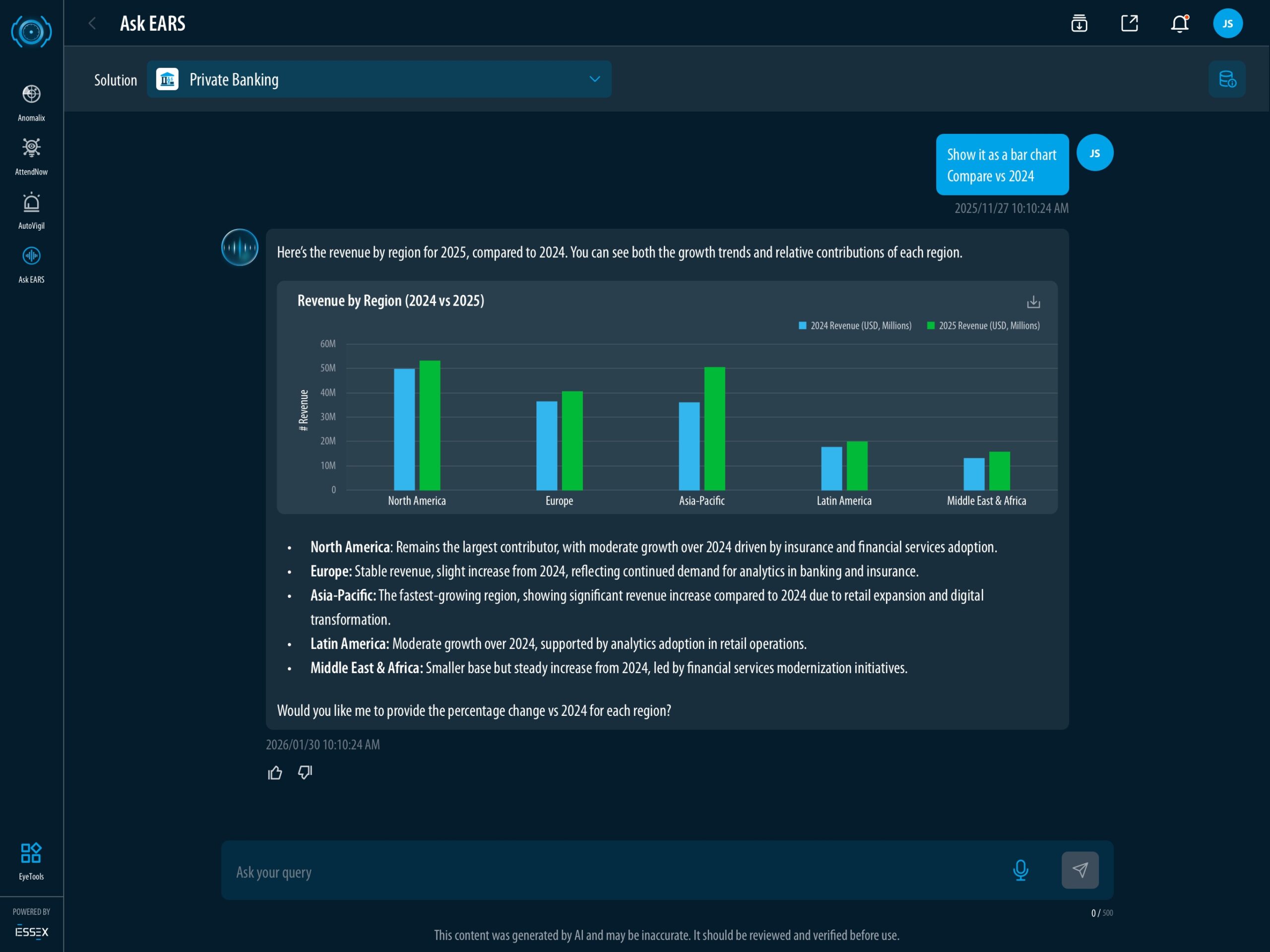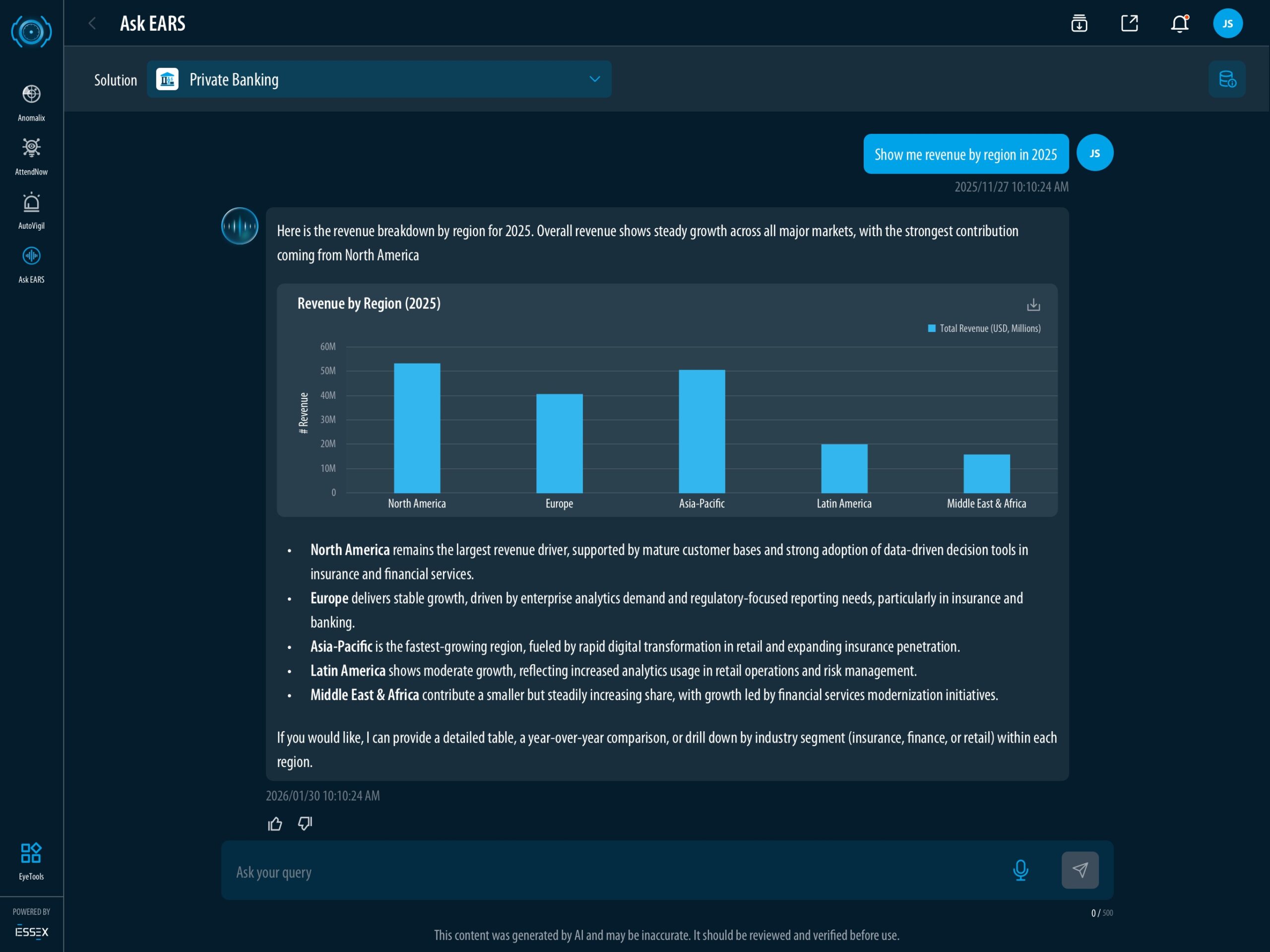 Ask EARS™ returns revenue data by region.