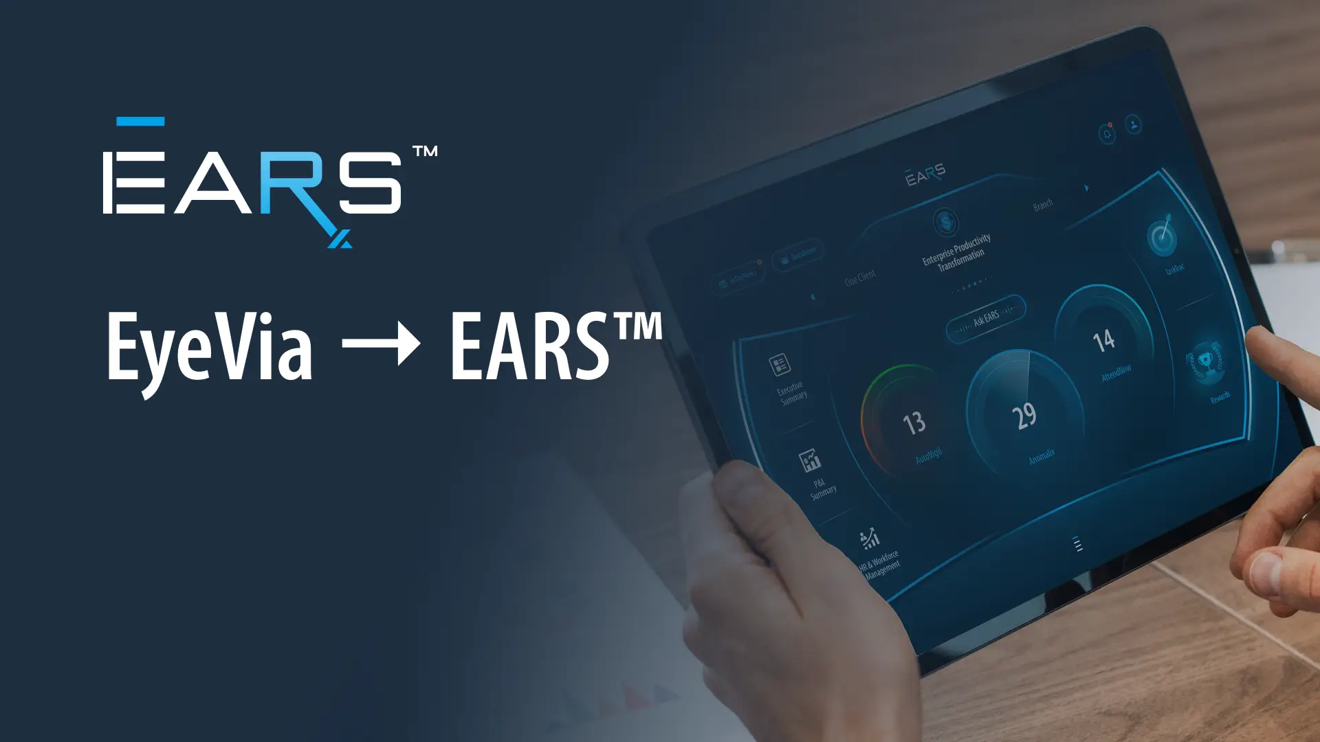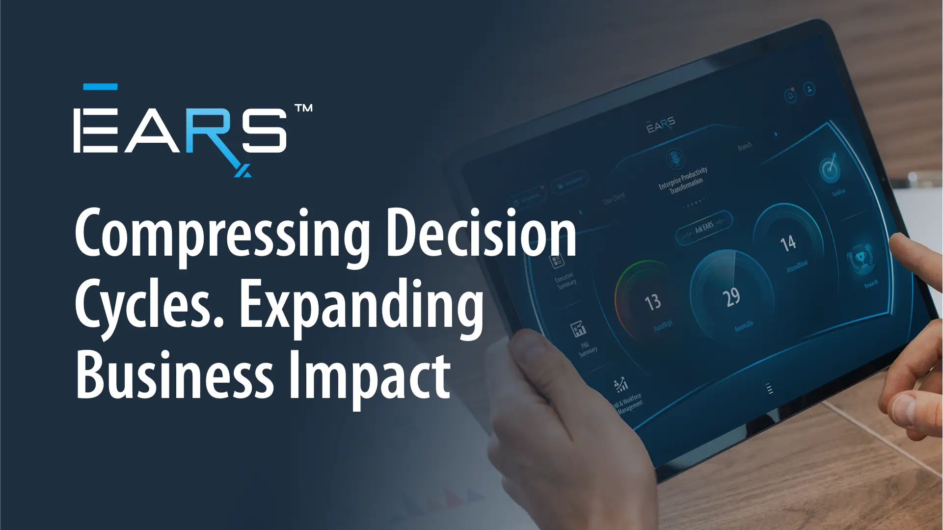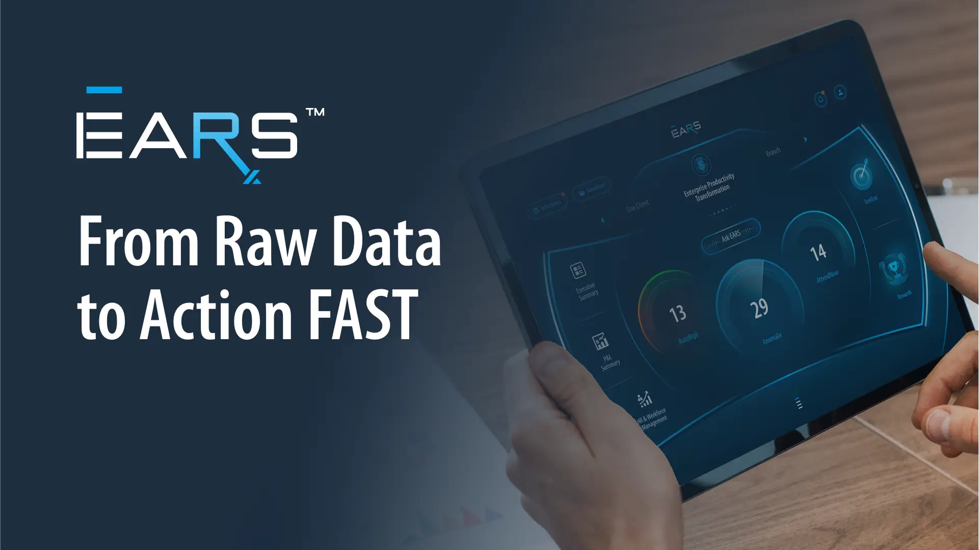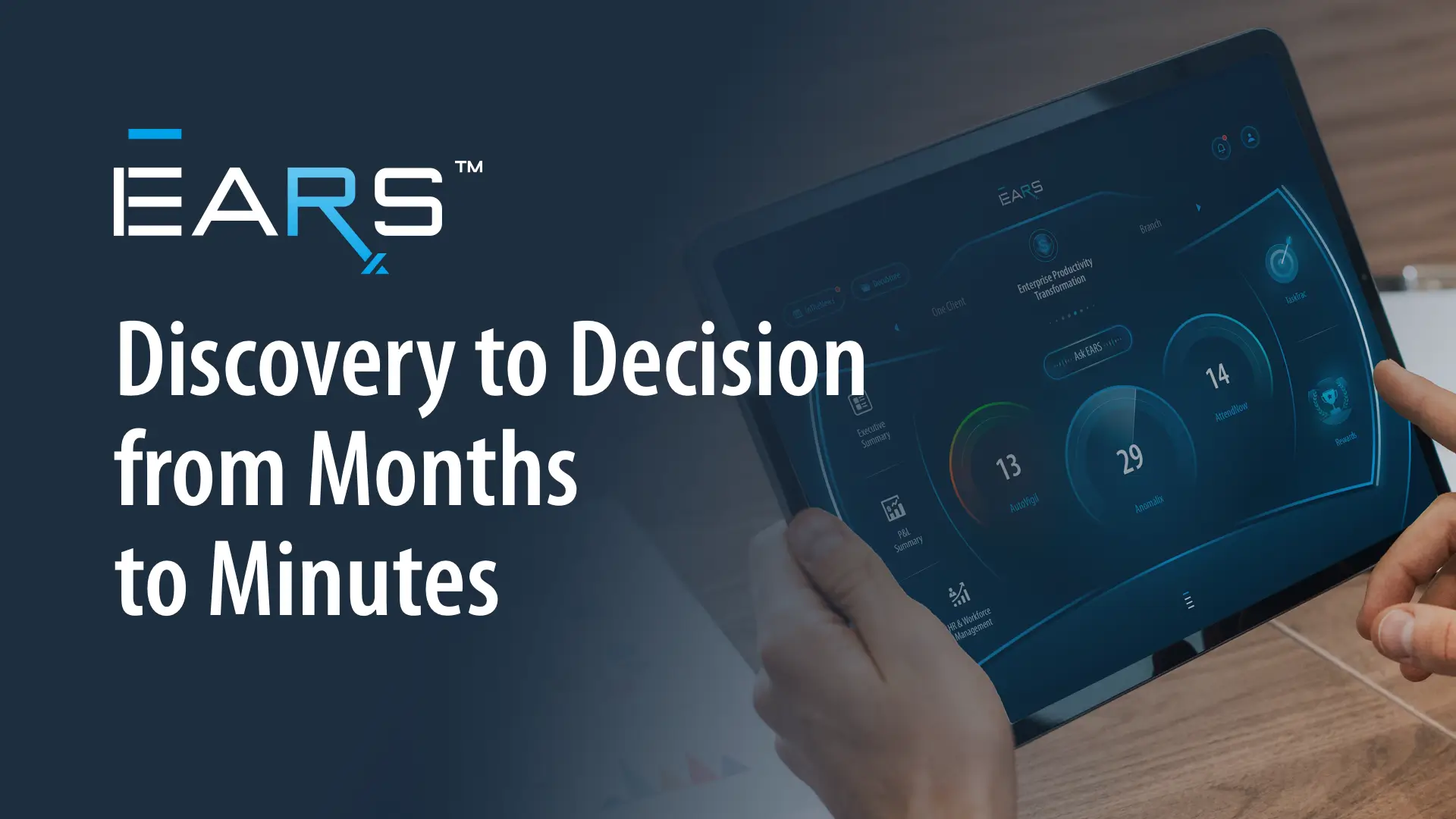 Previous Step Next Step   An executive cockpit EARS™ 04 / 11 EARS™ introduces AI engines and widgets that actively scan data, detect issues, predict outcomes, and guide executive response without waiting for manual analysis.   Previous Step Next Step   Generative AI for executive questions Ask EARS™ 05 / 11 Ask EARS™ allows users to ask natural-language questions and receive contextual, business-aware responses, powered by privately trained generative AI models embedded within the platform.   Previous Step Next Step   Detecting what’s out of pattern Anomalix™ 06 / 11 Anomalix™ applies anomaly detection models to identify unusual or unexpected data behavior, helping surface risks and opportunities that may not be visible through standard reporting.   Previous Step Next Step   Continuous monitoring and alerts AutoVigil™ 06 / 11 AutoVigil™ automatically monitors predefined thresholds and conditions, generating alerts and warnings the moment attention is required—without the need for manual checks.   Previous Step Next Step   Immediate operational focus AttendNow™ 08 / 11 AttendNow™ consolidates operational items that require immediate attention into a clear, prioritized view, helping teams move efficiently from insight to action.   Previous Step Next Step   Activating governance and response TaskTrac™ 09 / 11 TaskTrac™ connects signals to action by triggering governance workflows and executive responses, ensuring accountability and timely follow-through.   Previous Step Next Step   Predictive, forward-looking intelligence NostraD™ 10 / 11 NostraD™ delivers AI-driven projections that surface future trends and emerging opportunities, enabling proactive and forward-looking decision-making. Aligning teams around insight and action Built-in communication tools help teams share insights, alerts, and decisions across stakeholders, ensuring alignment, clarity, and coordinated execution. Communication Tools 11 / 11   Previous Step check   Finish You’re ready to explore EARS™ and put its new features to work. Replay Start Music   play_circle_outline