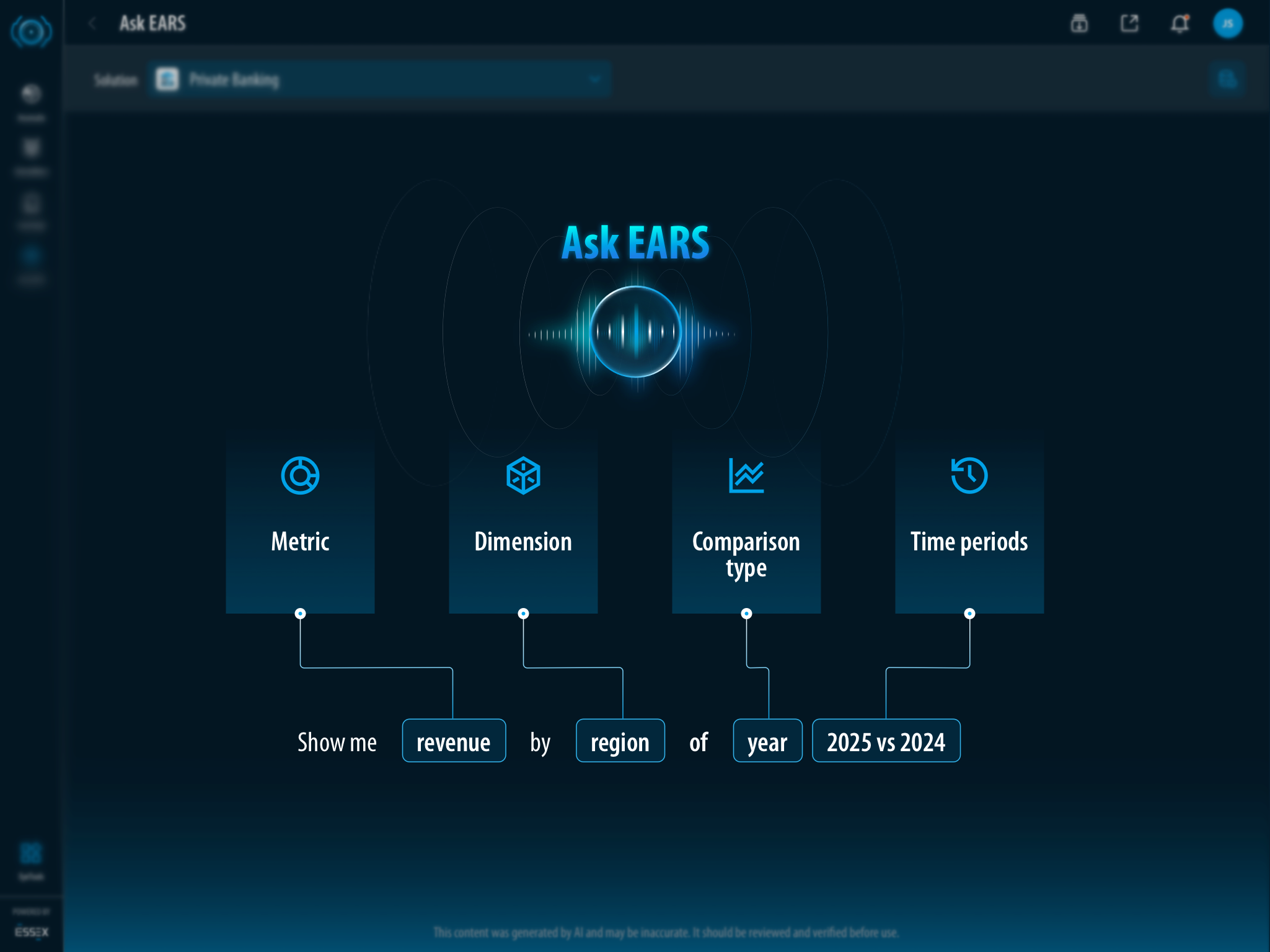 Ask EARS™ Start Tutorial Learn how to compare metrics across time periods using natural language in Ask EARS™, without setting filters or building reports. How to Compare Metrics Instantly in Ask EARS™ Access the AI assistant from the cockpit Next   Open Ask EARS™ 01 / 05