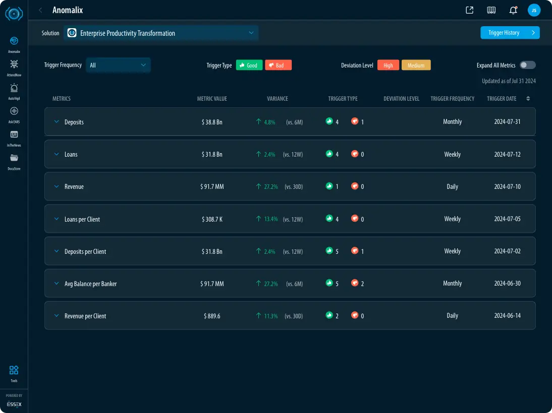 Anomalix Start Tutorial Quickly understand how to access Anomalix and explore key drivers behind anomaly signals. Read Anomalix Signal in 3 Steps From the EARS™ landing page, click Enter Anomalix. Result: You see the full Anomalix table. Open Anomalix 01 / 05
